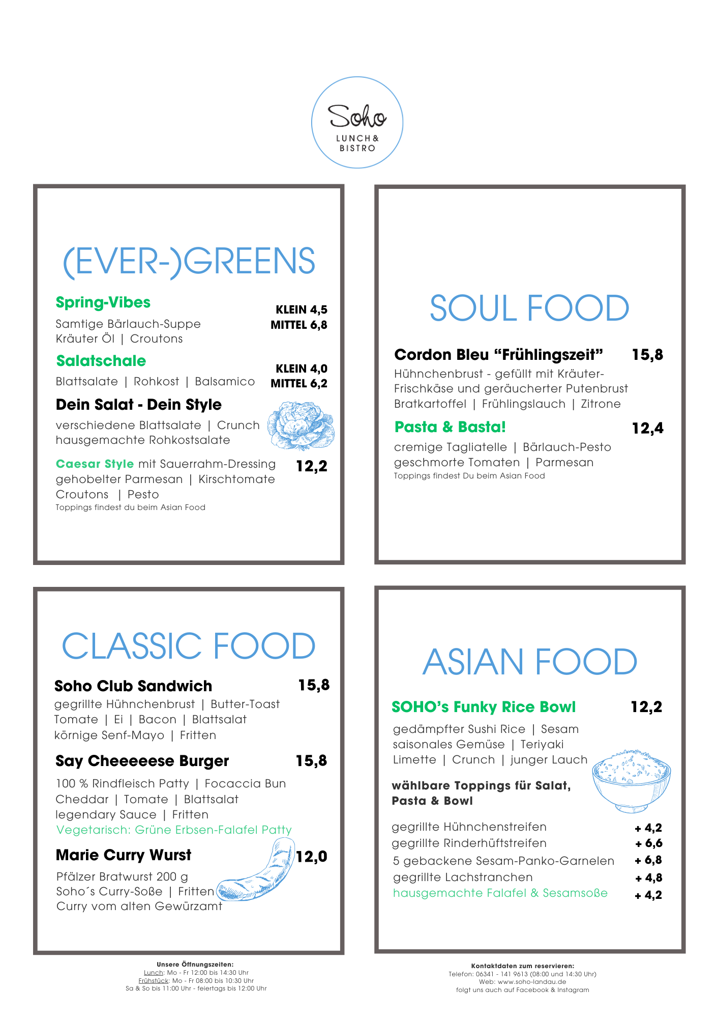 Keine Lust auf eine langweilige Weihnachtsfeier? Dann ab ins SOHO-HO-HO-HO. Ab 35 Personen in unserem Restaurant ein weihnachtliches Buffet oder Menü genießen (Infos unter GENIESSEN). Oder im Team kochen? Ab 8 Personen in Goldbergs-Kochschule (Infos unter KOCHEN).
