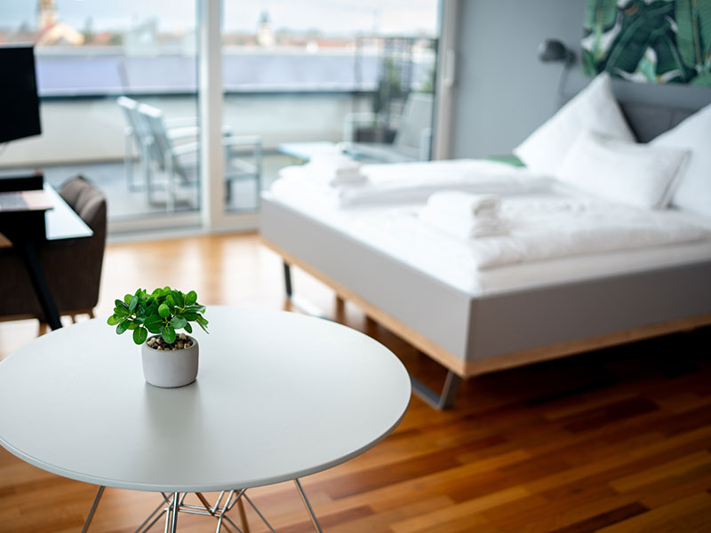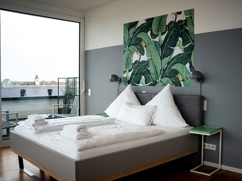 Unsere individuell eingerichteten Penthouse-Zimmer im Neubau verfügen über eine eigene Dachterrasse mit Lounge-Möbeln und grenzenloser Freiheit.
