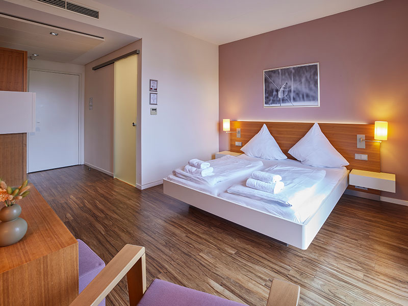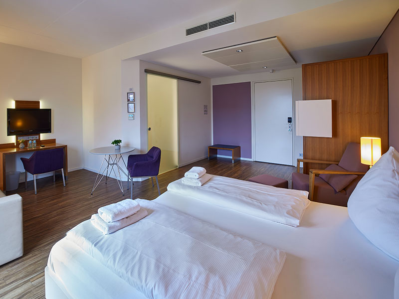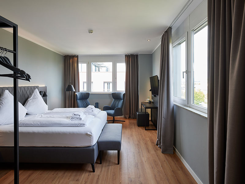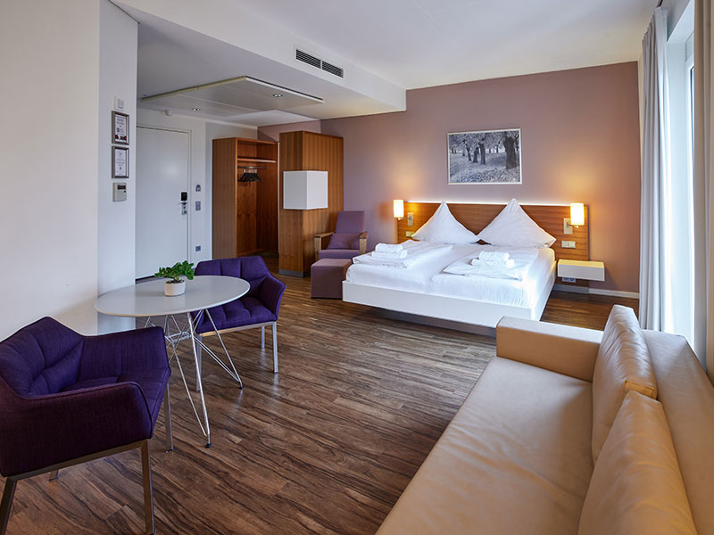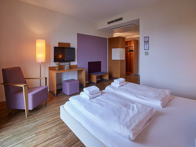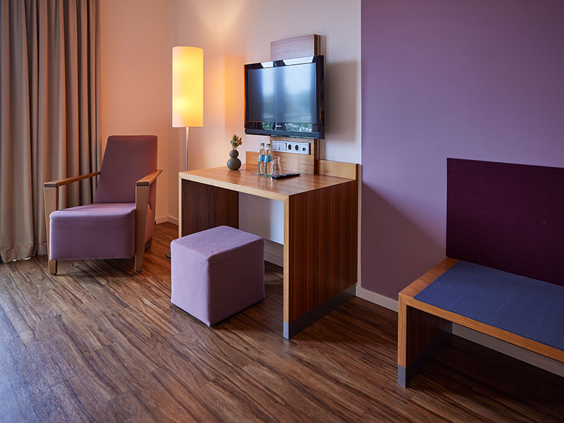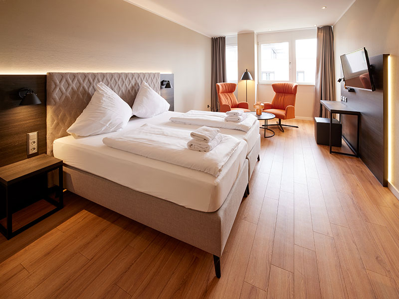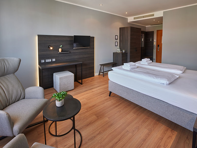 In unseren modern eingerichteten Zimmern der Kategorie Superior PLUS (im Neubau) finden Sie komfortable Erholung nach einem anstrengenden Arbeitstag, mit einer barrierefreien Ausstattung.